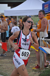 I started slow and just kept my feet moving. I tried not to take very deep breaths. Luckily it was pretty over cast and there was a slight breeze blowing in the beginning, so I wasn't getting real hot. I drank some gatorade and just focused on putting one foot in front of the other. One of my competitors (who usually beats me on the run every year) passed me about half a mile in. It was tough to watch her go, but I knew that today there was no way I'd keep up. Steady gets the job done and steady is what I did today.
